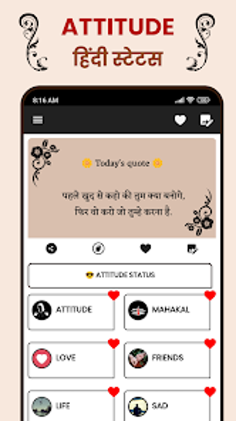 Attitude Status in Hindi, geniş bir Hindi şairi ve alıntı koleksiyonu sunan bir yaşam tarzı uygulamasıdır. Kullanıcılar, cesur tavır alıntılarından, motivasyonel sözlere ve eğlenceli mesajlara kadar çeşitli içeriklere ulaşabilirler. Uygulama, sosyal medyada paylaşmak üzere özel olarak tasarlanmış durum güncellemeleri oluşturma imkanı da sunmaktadır. Kullanıcılar, metin, fotoğraflar ve renklerle kişiselleştirilmiş mesajlar oluşturabilir ve favori durumlarını hızlı bir şekilde kaydedebilirler.